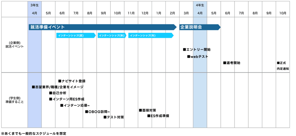 上記は大学3年生の4月頃にスタートした場合を想定した一般的な就活スケジュールです。